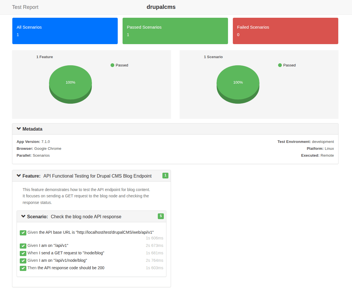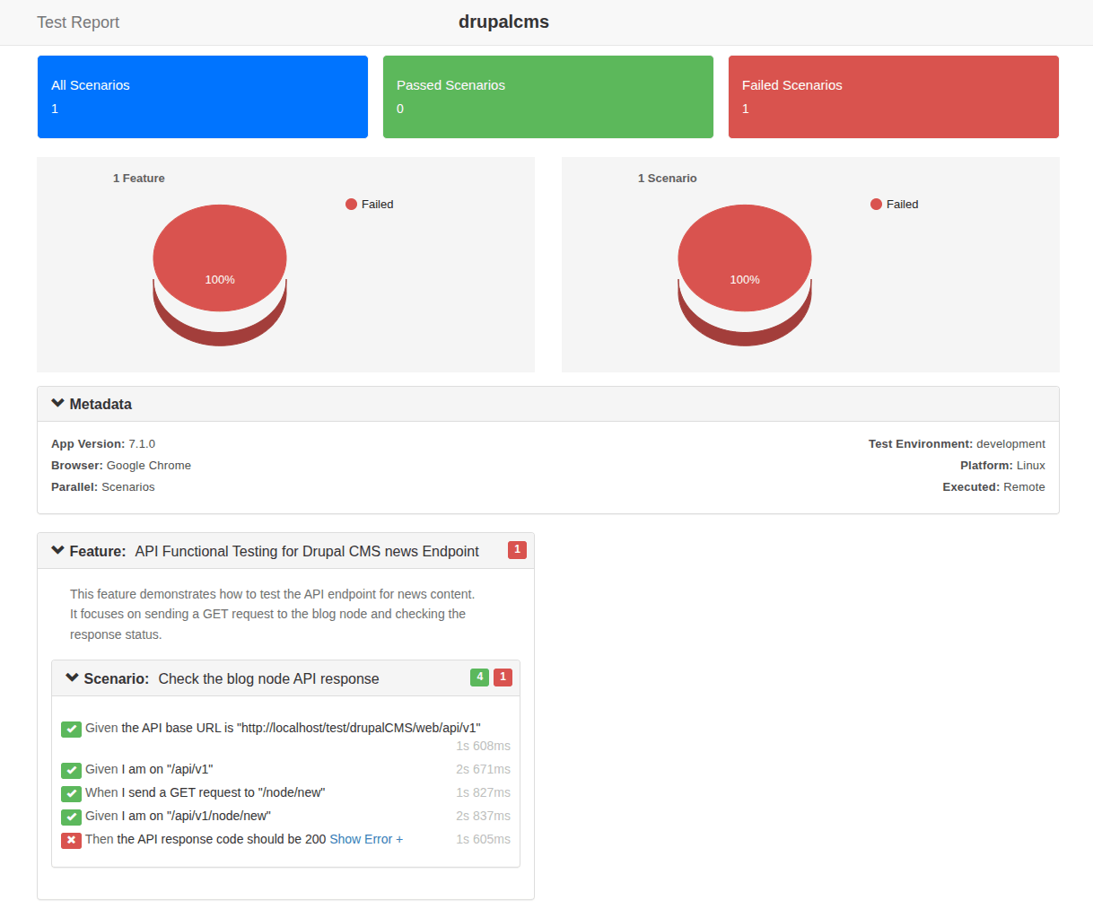Then the API response code should be 200And now, we’ll use the GET method to test the /node/new endpoint in Drupal CMS, which will produce an error since the endpoint does not exist or respond correctly.